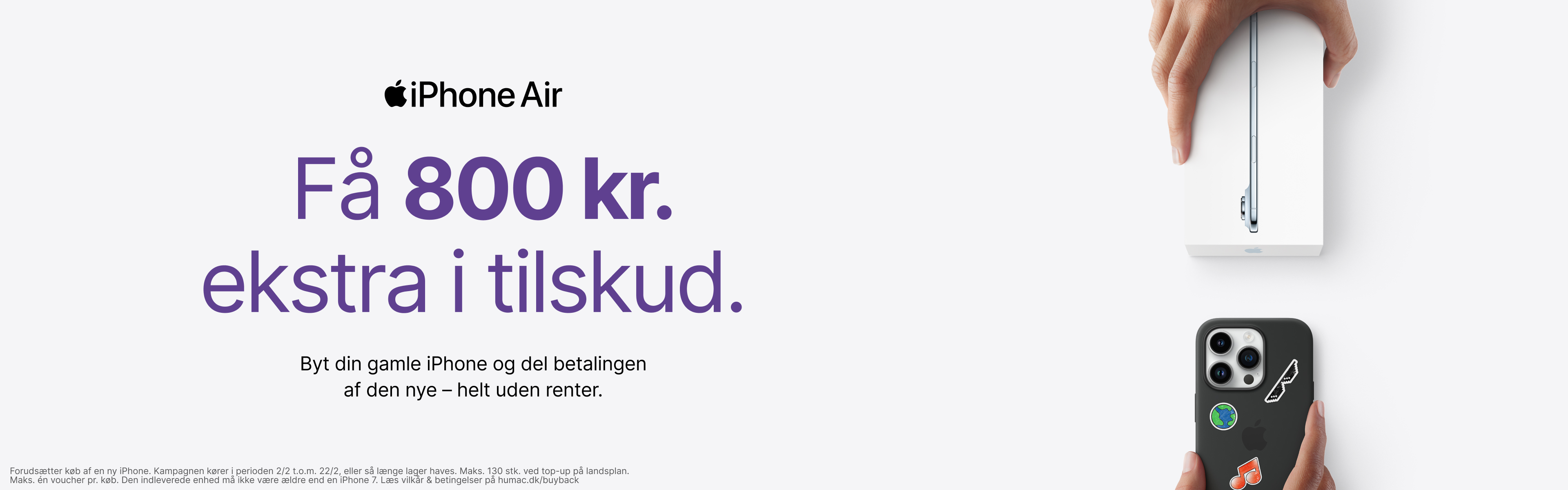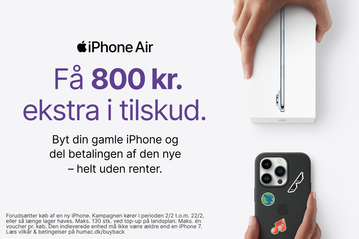 Opgrader din iPhone med BuyBack. Få 800 kr i tilskud oveni værdien af din gamle enhed som tilskud, når du køber et ny iPhone. Med BuyBack får du en særligt god pris for din nuværende enhed – uanset hvor gammel den er* – og rabat på dit næste køb. Tilbuddet gælder frem til den 22. Februar.