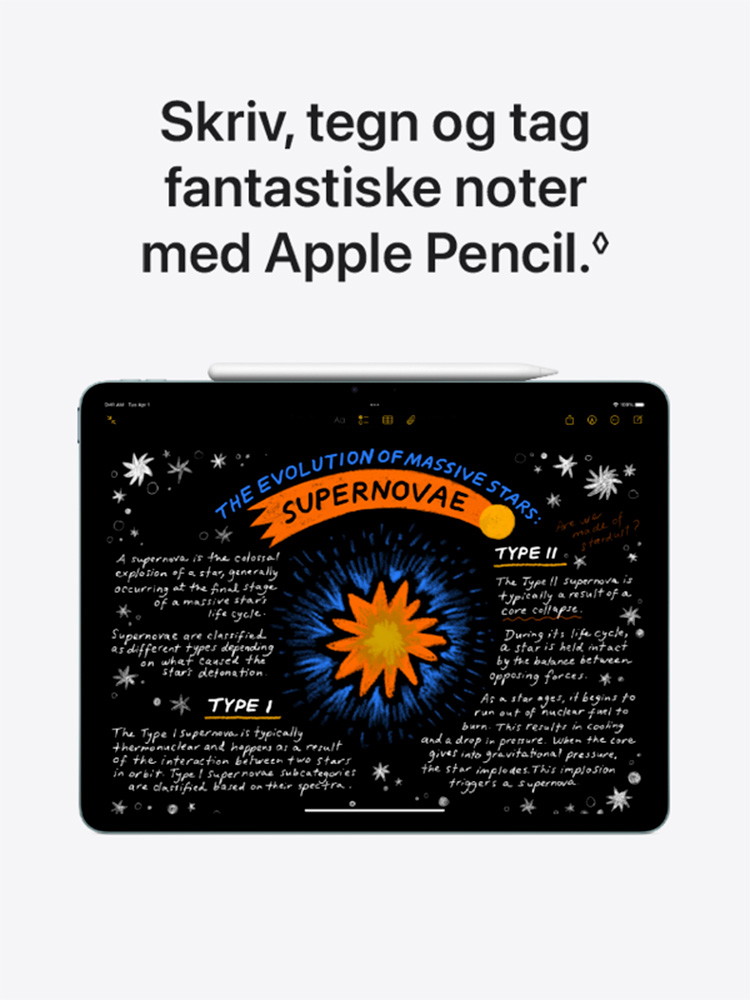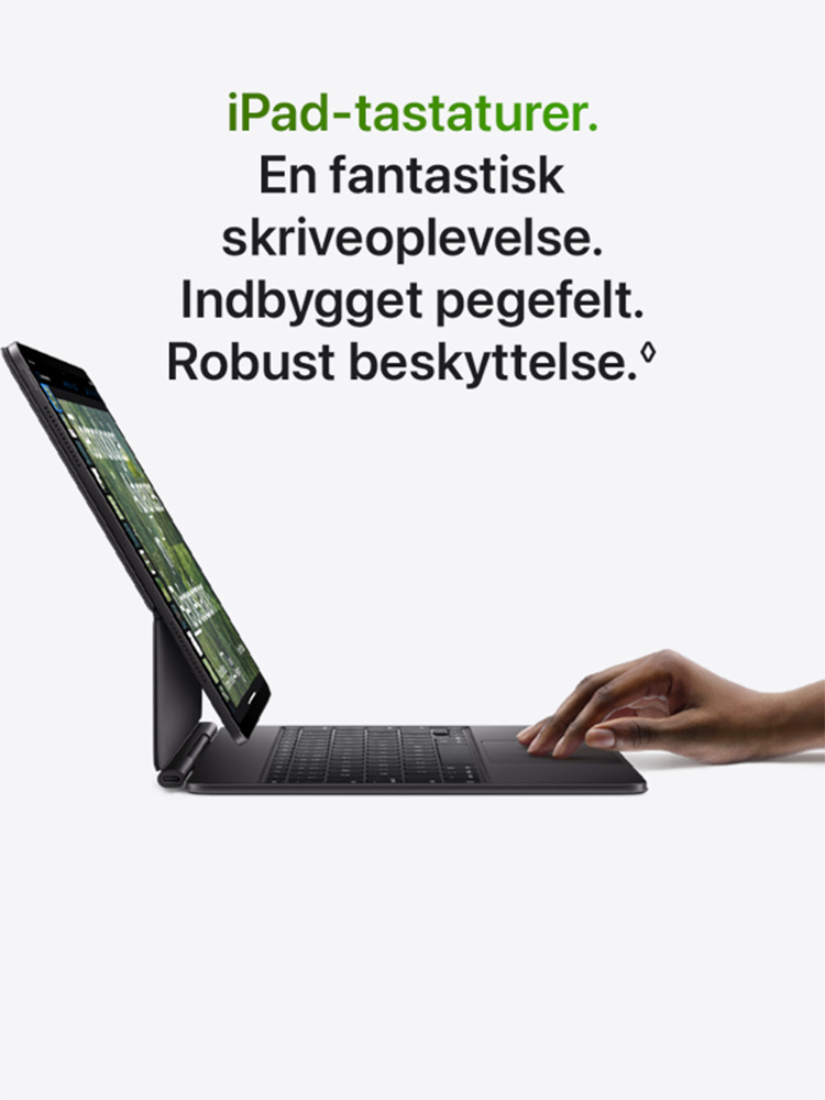Mobilnetværk og trådløs teknologi: Kræver dataabonnement. Hastighederne afhænger af de lokale forhold og din udbyder. Hør mere hos din udbyder eller på apple.com/dk/ipad/cellular.