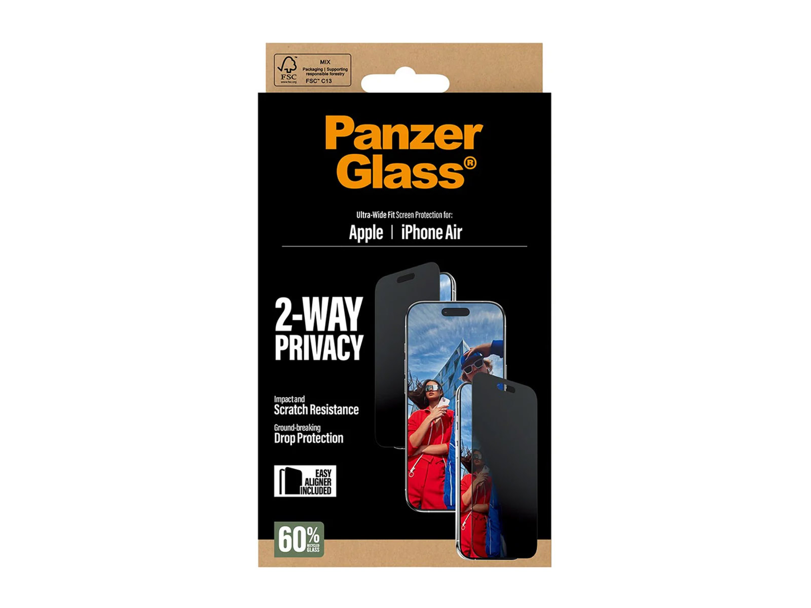 Bevar dit privatliv og beskyt skærmen med PanzerGlass® 2‑Way Privacy – hærdet glas med privatlivsfilter og Ultra‑Wide Fit til iPhone Air.