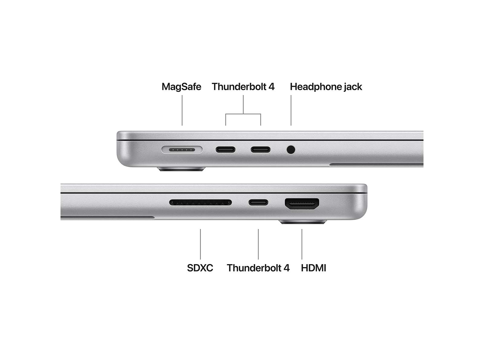 MacBook Pro med M5 leveres med samme portudvalg som forgængeren: flere Thunderbolt‑porte, HDMI, SDXC og MagSafe 3, så du kan tilslutte skærme, eksterne drev og andet udstyr uden at være afhængig af adaptere.