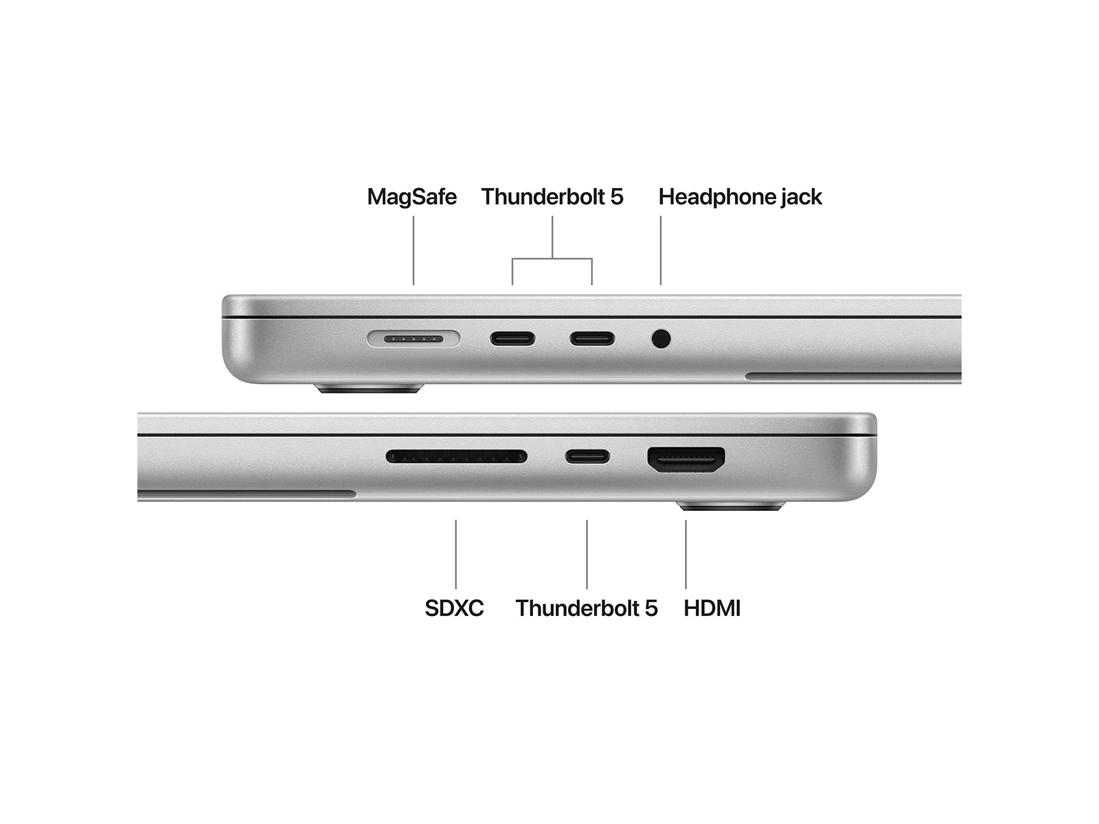 Med Thunderbolt, HDMI, SDXC og MagSafe 3 er du klar til skærme, hurtige eksterne enheder og enkel opladning – uanset om du arbejder stationært eller on the go.