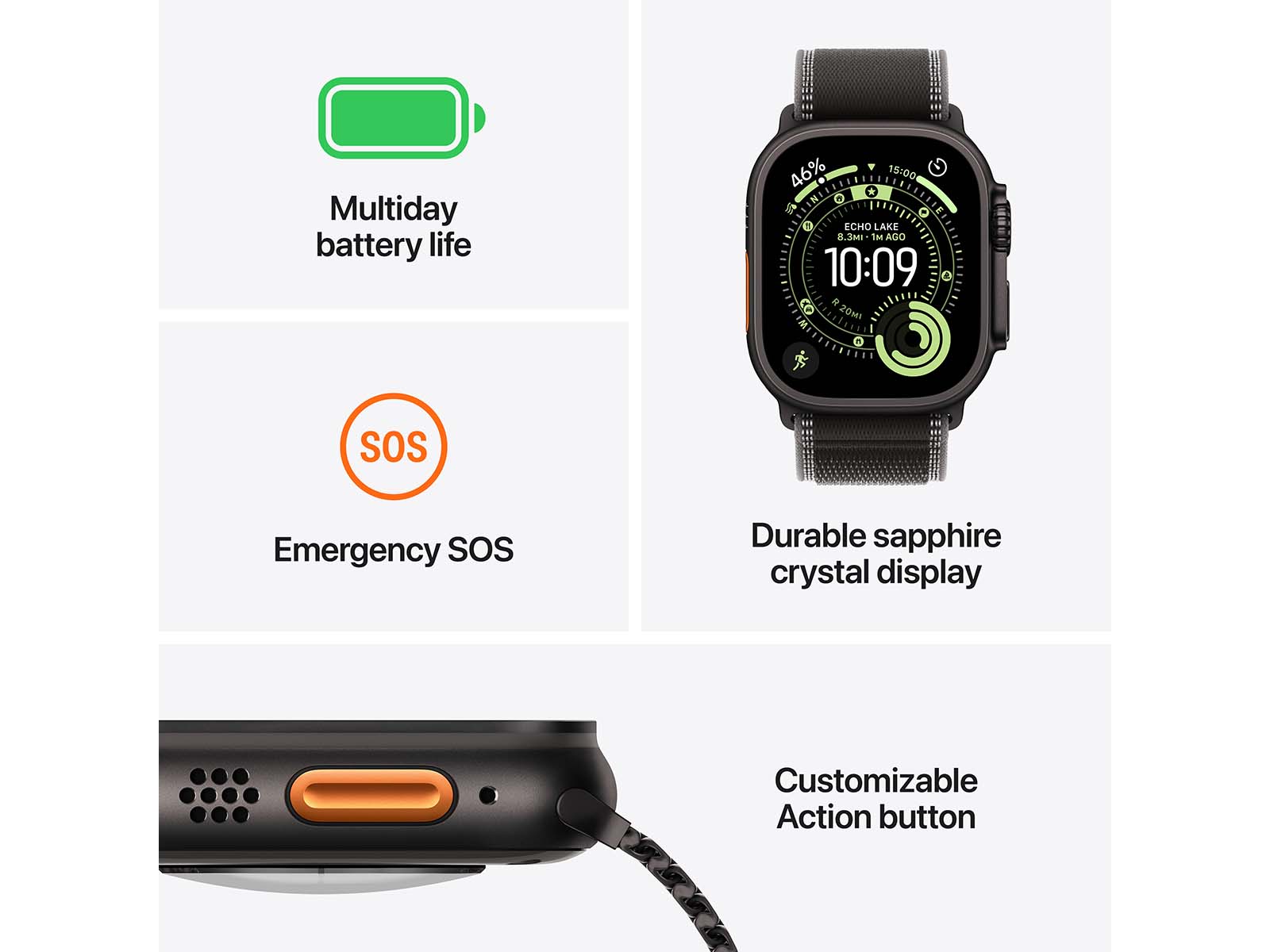 Apple Watch Ultra 3 er udstyret med Emergency SOS via satellit — du kan sende nødbeskeder, dele din position og nå hjælp, selv når mobilen er offline. Perfekt til fjeldvandring, bjergløb eller fjerne terræner.