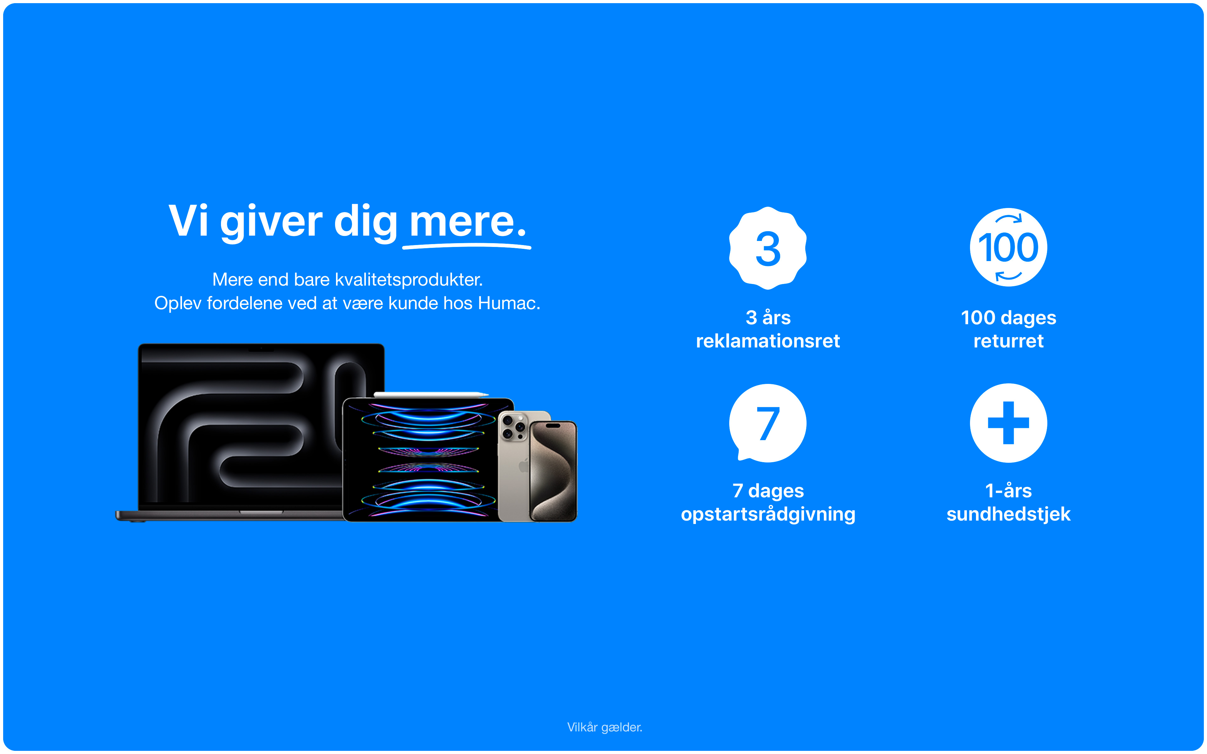 13 års reklamation. Udvidet reklamationsret gælder kun ved køb af ny iPhone, iPad eller Mac. 3 års reklamation gælder kun for privatkunder. Oveni dette gælder øvrige forhold for reklamationsret. Læs mere på humac.dk/handelsbetingelser. Er du erhvervskunde kan du læse handelsbetingelser for erhvervskunder på humac.dk/handelsbetingelser/erhvervskob.